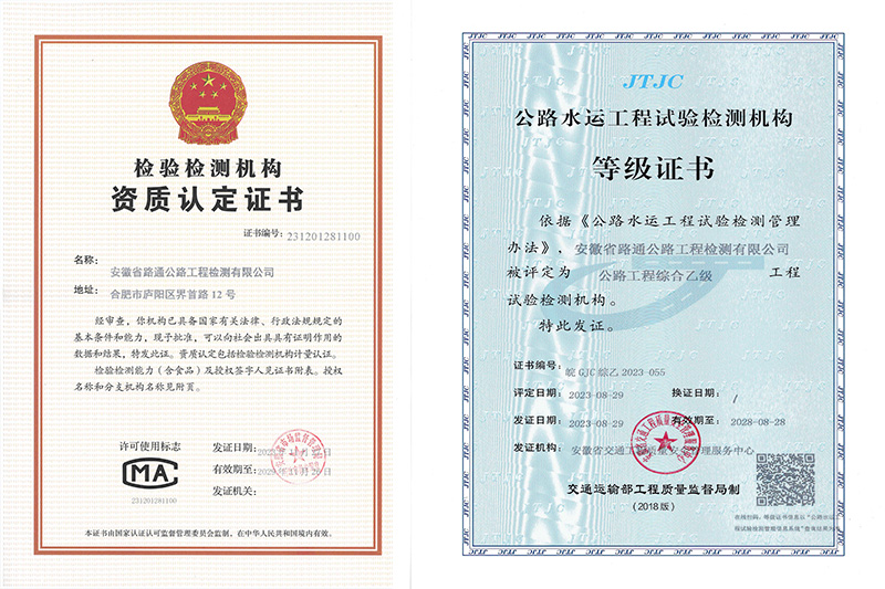 安徽省路通公路工程檢測(cè)有限公司成立于2003年7月。現(xiàn)擁有公路工程綜合乙級(jí)檢測(cè)資質(zhì)、排水管道檢測(cè)及評(píng)估作業(yè)能力III級(jí)作業(yè)證書(shū),并通過(guò)了檢驗(yàn)檢測(cè)機(jī)構(gòu)資質(zhì)認(rèn)定。2021年12月16日,獲批“高新技術(shù)企業(yè)”。各專業(yè)試驗(yàn)檢測(cè)人員配備齊全,具備開(kāi)展集料、鋼材、土工、瀝青及瀝青混合料、水泥及水泥混凝土、砂漿、無(wú)機(jī)結(jié)合料、水、外加劑、磚以及路基路面、混凝土結(jié)構(gòu)物、基坑地基與基樁、橋梁結(jié)構(gòu)、交安設(shè)施、公路與橋梁技術(shù)狀況和城鎮(zhèn)排水管道檢測(cè)等多項(xiàng)試驗(yàn)檢測(cè)的能力。