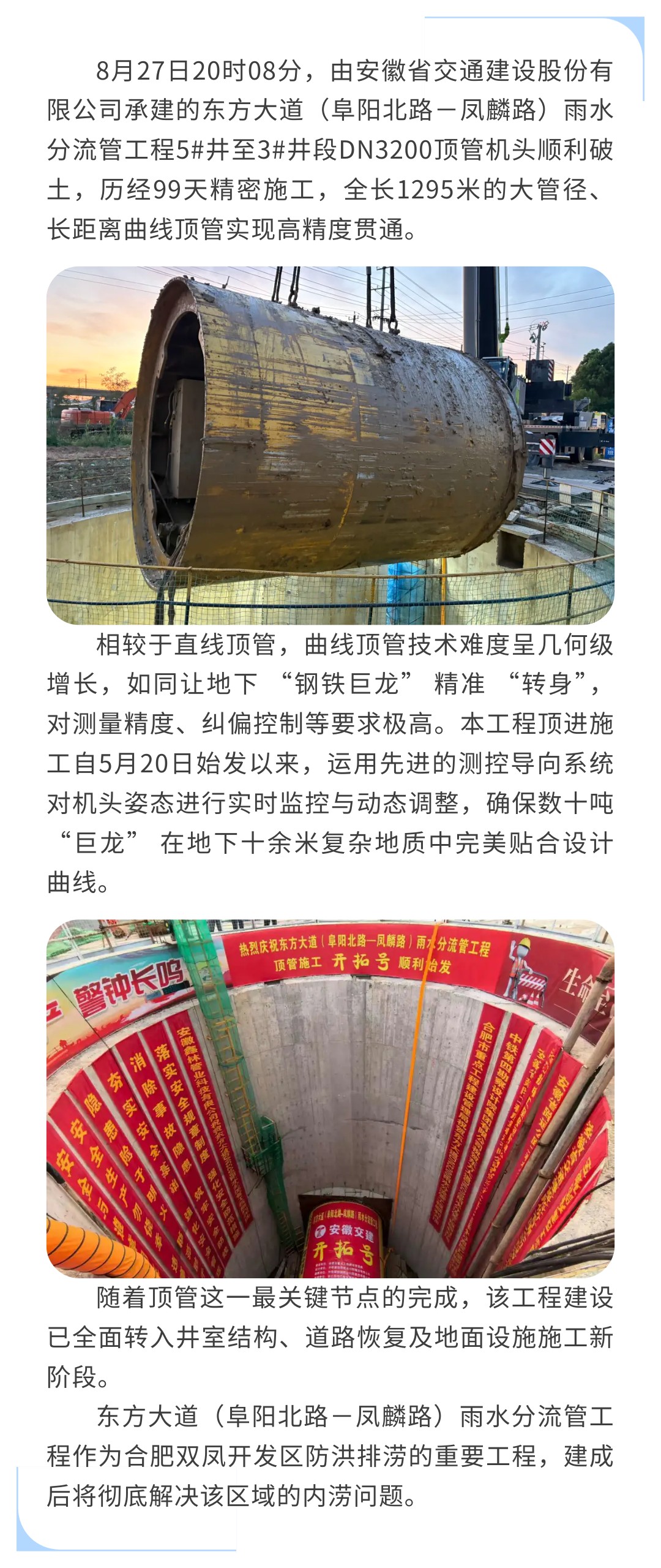 地下長(zhǎng)龍“絲滑”過彎|東方大道(阜陽(yáng)北路-鳳麟路)雨水分流管工程大管徑曲線頂管全線貫通