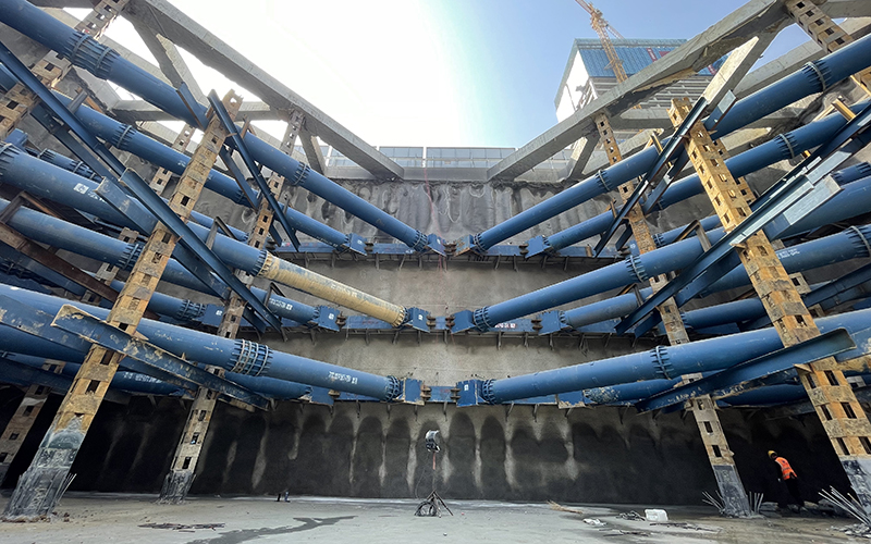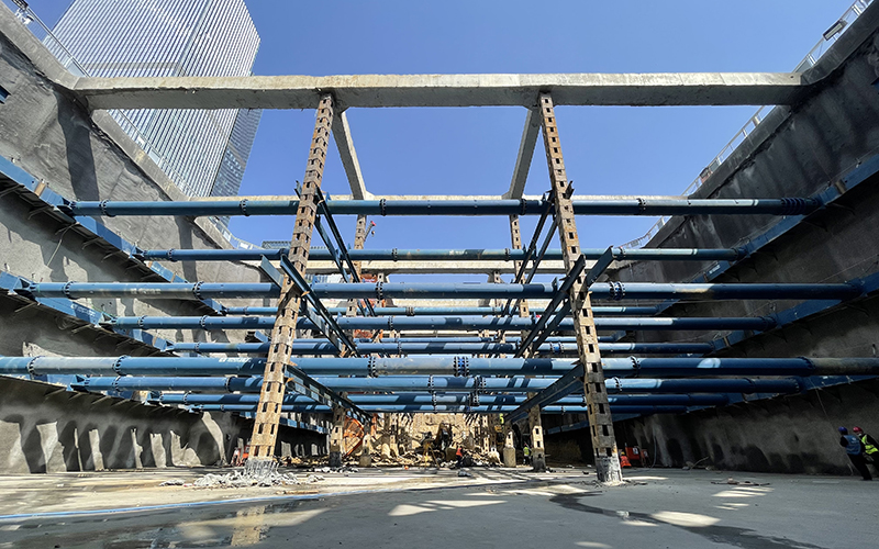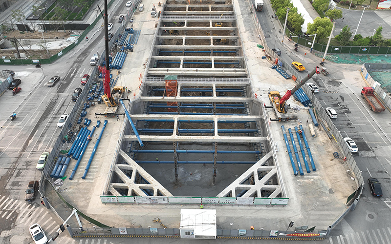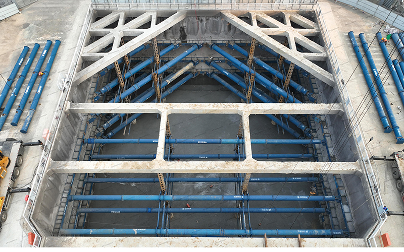 雙層段基坑深度17m,縱向長度32m,橫向長度33.8m。深基坑作業(yè)危險因素眾多,為保障基坑安全開挖,項目在開挖前進行多次模擬推演,預估風險源并不斷優(yōu)化施工方案。開挖過程中遵循時空效應,采取“先撐后挖、水平分段、豎向分層”原則,做到“分層、分步、對稱、平衡、限時”五個要點,雙層下穿段土方量1.9萬m3,經過連續(xù)作業(yè)4月16日完成基坑開挖并通過五方責任主體單位基坑驗槽,4月19日完成墊層混凝土澆筑。