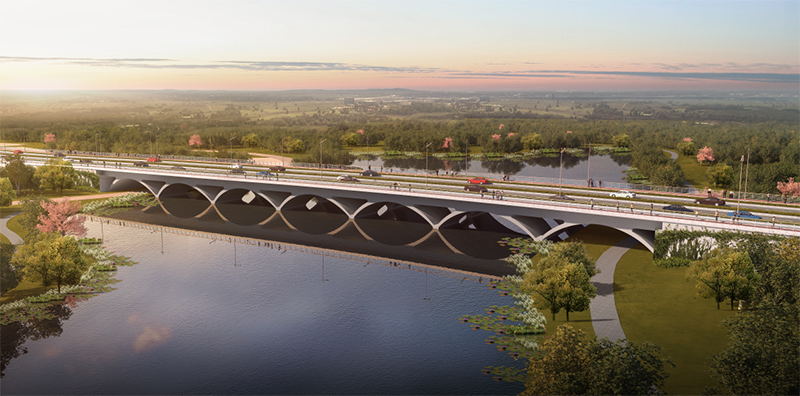 黃河路以“穿透共融、自然綠苑”為設計理念,融入自然與城市的生態(tài)廊道、見水見林不見路的景觀綠道。道路兩旁兩側栽植800多棵高桿櫻花樹,花期在每年3月中旬,觀賞期為15天左右,屆時將成為名副其實的“櫻花大道”。同時工程包含一座187米的七跨連拱橋,橫跨錦繡東湖,造型優(yōu)美,輕盈靈動。