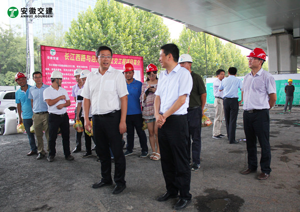 7月28日下午,合肥市副市長寧波在市重點局局長張家祥、副局長鄭浩、安徽省交通建設股份有限公司(以下簡稱安徽交建)總裁高楊等人的陪同下,蒞臨安徽交建長江西路與沿線道路立交工程項目施工現(xiàn)場,慰問奮戰(zhàn)在高溫一線的道路建設者們。