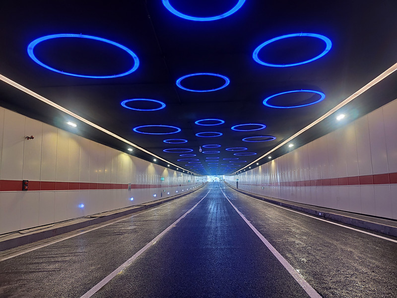 在隧道裝修方面,入口設(shè)置形如天鵝展翅遮光棚,改善進出隧道行車視線;隧道內(nèi)白墻黑頂,紅色腰線伸向遠處,內(nèi)頂鑲嵌圓形LED燈飾,如湖底映射的一個個藍色漣漪。