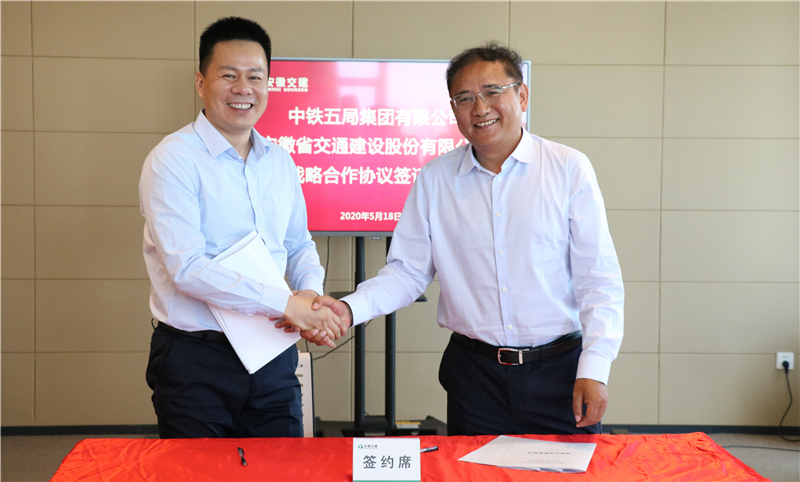 安徽省交通建設(shè)股份有限公司總裁彭小毛與中鐵五局華東區(qū)域指揮部副指揮長趙文軍代表雙方簽署了戰(zhàn)略合作協(xié)議,雙方經(jīng)營管理層代表一同參加了簽約儀式。